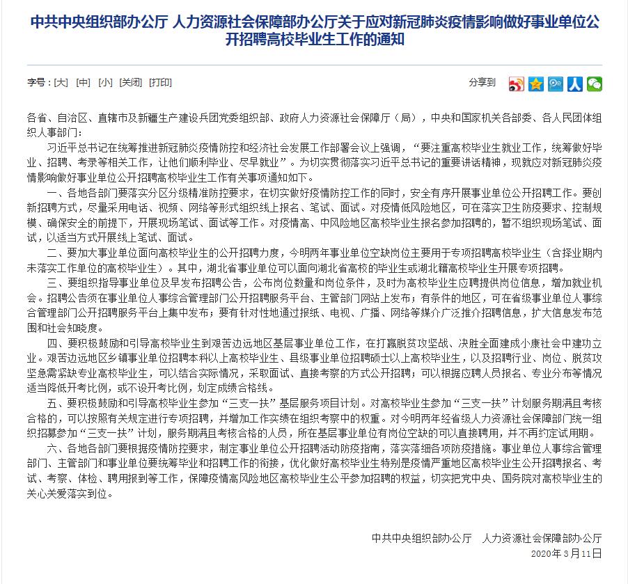 習(xí)近平總書(shū)記在統(tǒng)籌推進(jìn)新冠肺炎疫情防控和經(jīng)濟(jì)社會(huì)發(fā)展工作部署會(huì)議上強(qiáng)調(diào),“要注重高校畢業(yè)生就業(yè)工作,統(tǒng)籌做好畢業(yè)、招聘、考錄等相關(guān)工作,讓他們順利畢業(yè)、盡早就業(yè)”。為切實(shí)貫徹落實(shí)習(xí)近平總書(shū)記的重要講話(huà)精神,現(xiàn)就應(yīng)對(duì)新冠肺炎疫情影響做好事業(yè)單位公開(kāi)招聘高校畢業(yè)生工作有關(guān)事項(xiàng)通知如下。