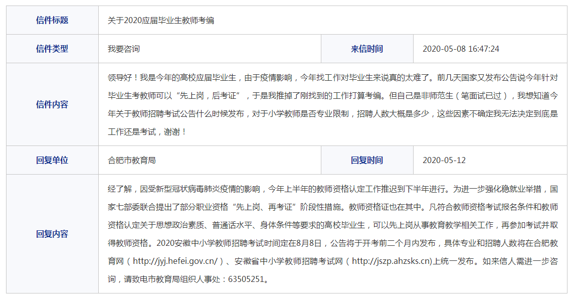 信件內(nèi)容:領(lǐng)導(dǎo)好!我是今年的高校應(yīng)屆畢業(yè)生,由于疫情影響,今年找工作對畢業(yè)生來說真的太難了。前幾天國家又發(fā)布公告說今年針對畢業(yè)生考教師可以“先上崗,后考證”,于是我推掉了剛找到的工作打算考編。但自己是非師范生(筆面試已過),我想知道今年關(guān)于教師招聘考試公告什么時候發(fā)布,對于小學(xué)教師是否專業(yè)限制,招聘人數(shù)大概是多少,這些因素不確定我無法決定到底是工作還是考試,謝謝!