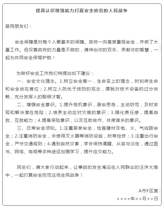結(jié)語:這個段落主要起號召作用。當(dāng)交代完所要宣傳的內(nèi)容以后,就要號召宣傳對象來落實踐行所宣傳的內(nèi)容,這樣的話,宣傳稿才算完整。