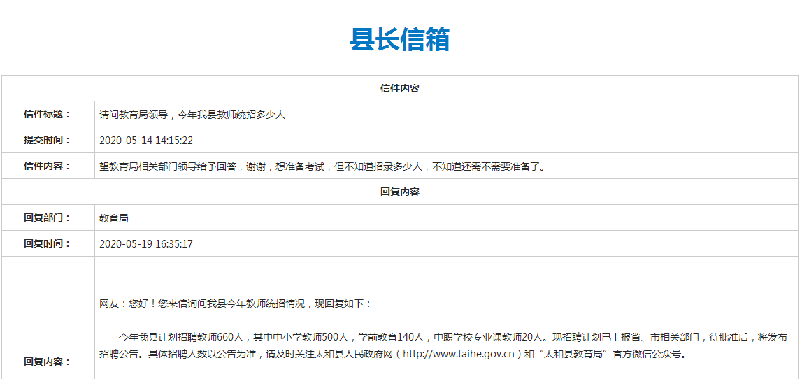網友:您好!您來信詢問我縣今年教師統(tǒng)招情況,現回復如下: