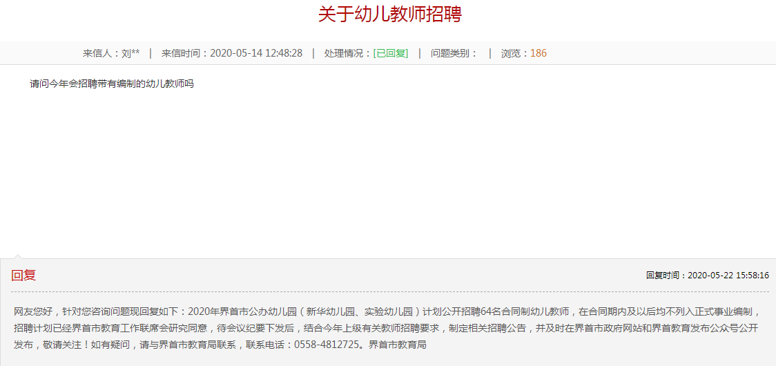 網(wǎng)友您好,針對(duì)您咨詢問(wèn)題現(xiàn)回復(fù)如下:2020年界首市公辦幼兒園(新華幼兒園、實(shí)驗(yàn)幼兒園)計(jì)劃公開招聘64名合同制幼兒教師,在合同期內(nèi)及以后均不列入正式事業(yè)編制,招聘計(jì)劃已經(jīng)界首市教育工作聯(lián)席會(huì)研究同意,待會(huì)議紀(jì)要下發(fā)后,結(jié)合今年上級(jí)有關(guān)教師招聘要求,制定相關(guān)招聘公告,并及時(shí)在界首市政府網(wǎng)站和界首教育發(fā)布公眾號(hào)公開發(fā)布,敬請(qǐng)關(guān)注!如有疑問(wèn),請(qǐng)與界首市教育局聯(lián)系,聯(lián)系電話:0558-4812725。界首市教育局
