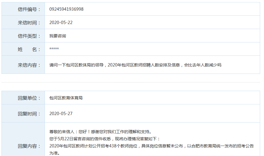 回復內(nèi)容:尊敬的來信人:您好!感謝您對我們工作的理解和支持。您于5月22日留言咨詢的信件收悉,現(xiàn)將辦理情況答復如下:2020年包河區(qū)教師計劃公開招考438個教師崗位,具體崗位信息暫未公布,以合肥市教育局統(tǒng)一發(fā)布的招考公告為準。