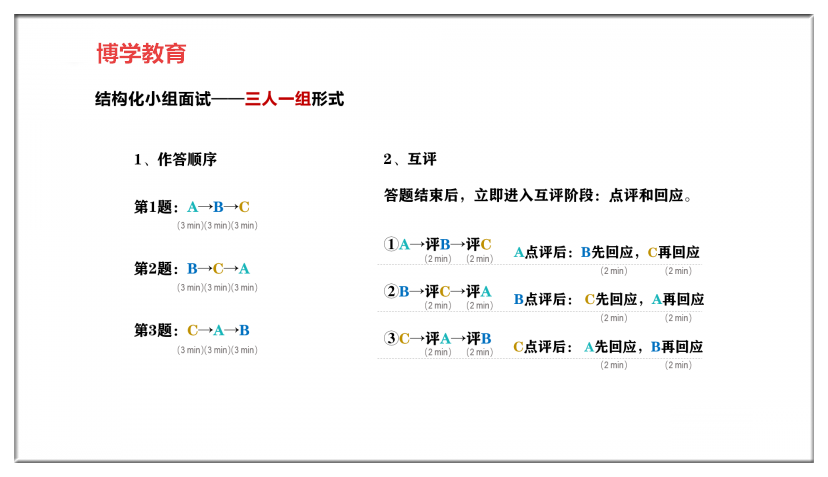 (1)結(jié)構(gòu)化小組互評(píng):15分鐘場外備考看題,進(jìn)入考場后,按要求每人依次答題,每道題目3分鐘(注:個(gè)人答題時(shí)間:2020年—2021年均為3分鐘,2018年—2019年均為2分鐘);全部答題結(jié)束,按要求展開互評(píng),點(diǎn)評(píng)每人的時(shí)間為2分鐘;被點(diǎn)評(píng)人針對(duì)點(diǎn)評(píng)展開回應(yīng),時(shí)間2分鐘。