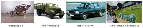 淮海戰(zhàn)役的小推車;中國第一輛解放牌汽車; 首輛中外合資的汽車; 我國首個(gè)擁有核心技術(shù)的新能源汽車??吹竭@四幅圖片你想到了什么?