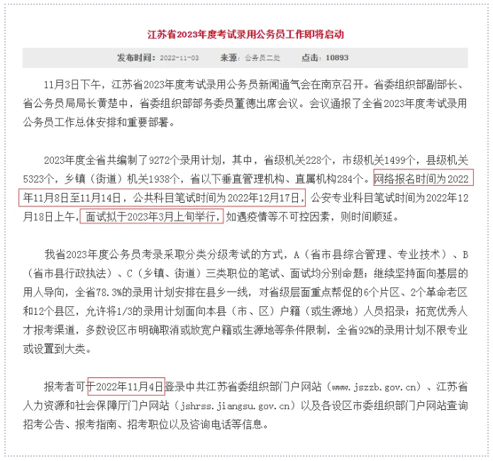2023江蘇公務(wù)員考試消息已出,快來查收重要信息:招錄人數(shù):9272人,其中,省級機(jī)關(guān)228個(gè),市級機(jī)關(guān)1499個(gè),縣級機(jī)關(guān)5323個(gè),鄉(xiāng)鎮(zhèn)(街道)機(jī)關(guān)1938個(gè),省以下垂直管理機(jī)構(gòu)、直屬機(jī)構(gòu)284個(gè)。