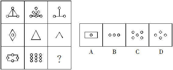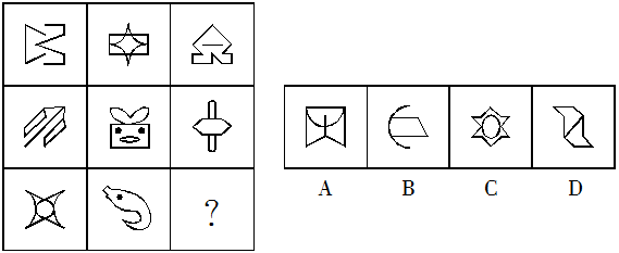 1.【答案】A。解析:每行或每列三個圖形的對稱軸各有0、1、2條,應(yīng)選擇有1條對稱軸的圖形,A符合。