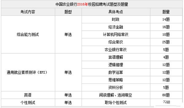 2018中國(guó)農(nóng)業(yè)銀行校園招聘考試內(nèi)容根據(jù)歷年考情來看,中國(guó)農(nóng)業(yè)銀行校招考試內(nèi)容基本變化不大,包括:通用素質(zhì)能力測(cè)試(EPI)、綜合能力測(cè)試、英語、性格測(cè)試。主要是在具體考試項(xiàng)目、題量上有相應(yīng)變化。(以下往年考試科目及題量?jī)H供參考,具體以2018農(nóng)行校園招聘考試為準(zhǔn)。)
